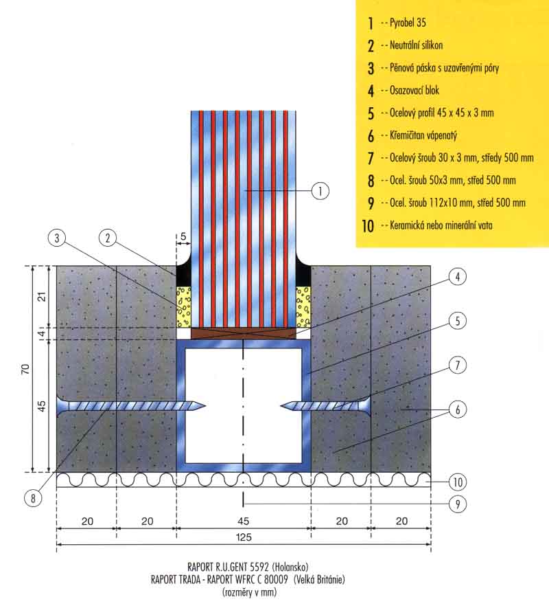 | Pyrobelite 35 | 90 minut zachování integrity | 90 minut nepřekročení mezních teplot | schéma | vlastnosti | testy | |